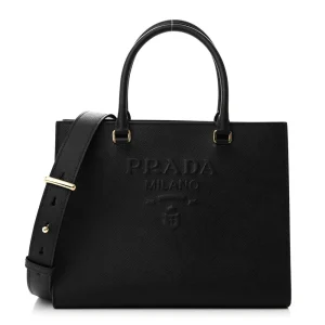 Lushentic Bag Medium Lux Logo Embossed Shoulder Tote Handbag Black Saffiano Leather