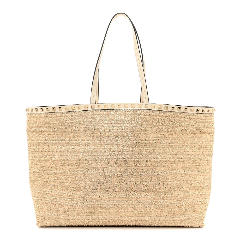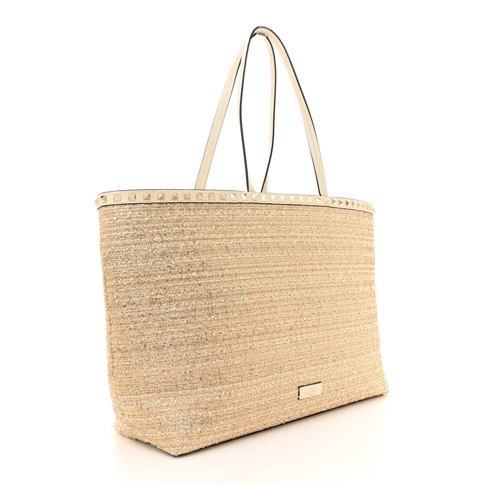 This Valentino Garavani Medium Rockstud Shoulder Tote in White/Gold/Ivory is luxurious. Metallic boucle raffia and calfskin leather offer a polished look. Spacious enough for daily essentials. Rockstud accents add an edgy flair. Suitable for work or casual outings. A timeless yet modern accessory.