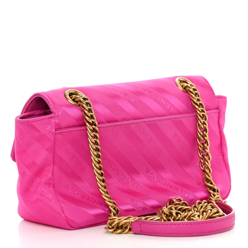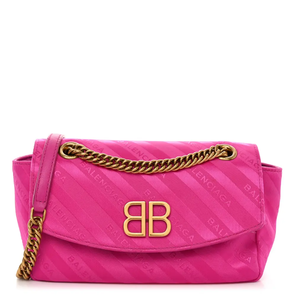 This Balenciaga S BB Round Shoulder Bag in Rose Magenta features nylon jacquard with a diagonal logo pattern for a trendy and vibrant design. Gold hardware enhances its modern appeal, making it a standout accessory. Its compact size is ideal for carrying essentials while maintaining a stylish look. The adjustable strap allows for versatile wear, transitioning effortlessly from day to night.