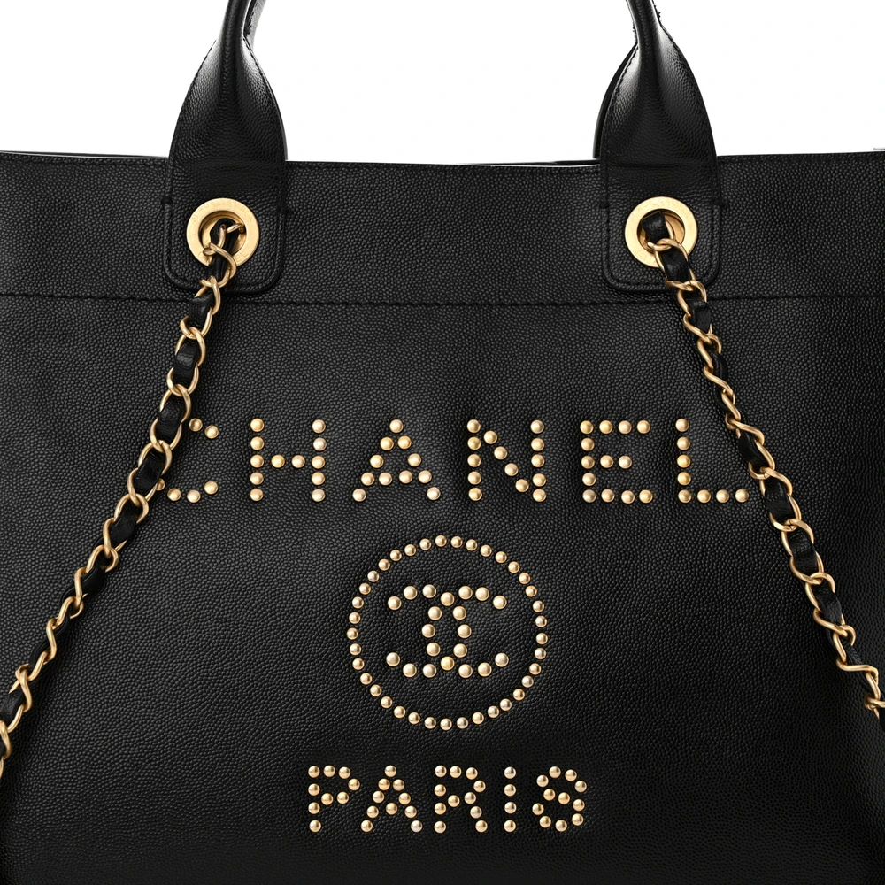 This Chanel Deauville Tote Small in Black Quilted Caviar Leather with Studded Gold Hardware is both stylish and practical. The durable caviar leather and quilted design ensure long-lasting elegance. Gold hardware with stud details adds a contemporary twist to its classic silhouette. Spacious and functional, it’s perfect for daily essentials with a glamorous touch. Tote handles and an optional strap offer versatile carrying options. A modern choice for any occasion.