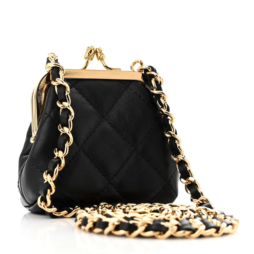 This Chanel Kiss Lock Clutch With Chain Mini in Black Quilted Lambskin Leather with Gold Hardware is a chic and compact accessory. The lambskin leather showcases Chanel’s classic quilted design, complemented by gold hardware. The kiss lock closure adds a vintage charm to its modern aesthetic. Perfect for carrying small essentials, it’s a stylish choice for evening events. The chain strap provides versatile carrying options. A delightful addition to any wardrobe.